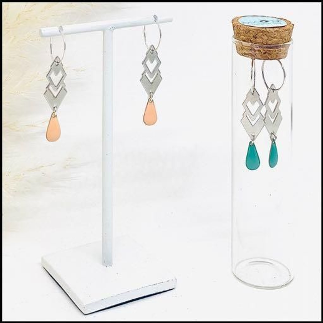 Boucles d'oreilles créoles en laiton argent et émaillé, vendues dans une fiole en verre.
